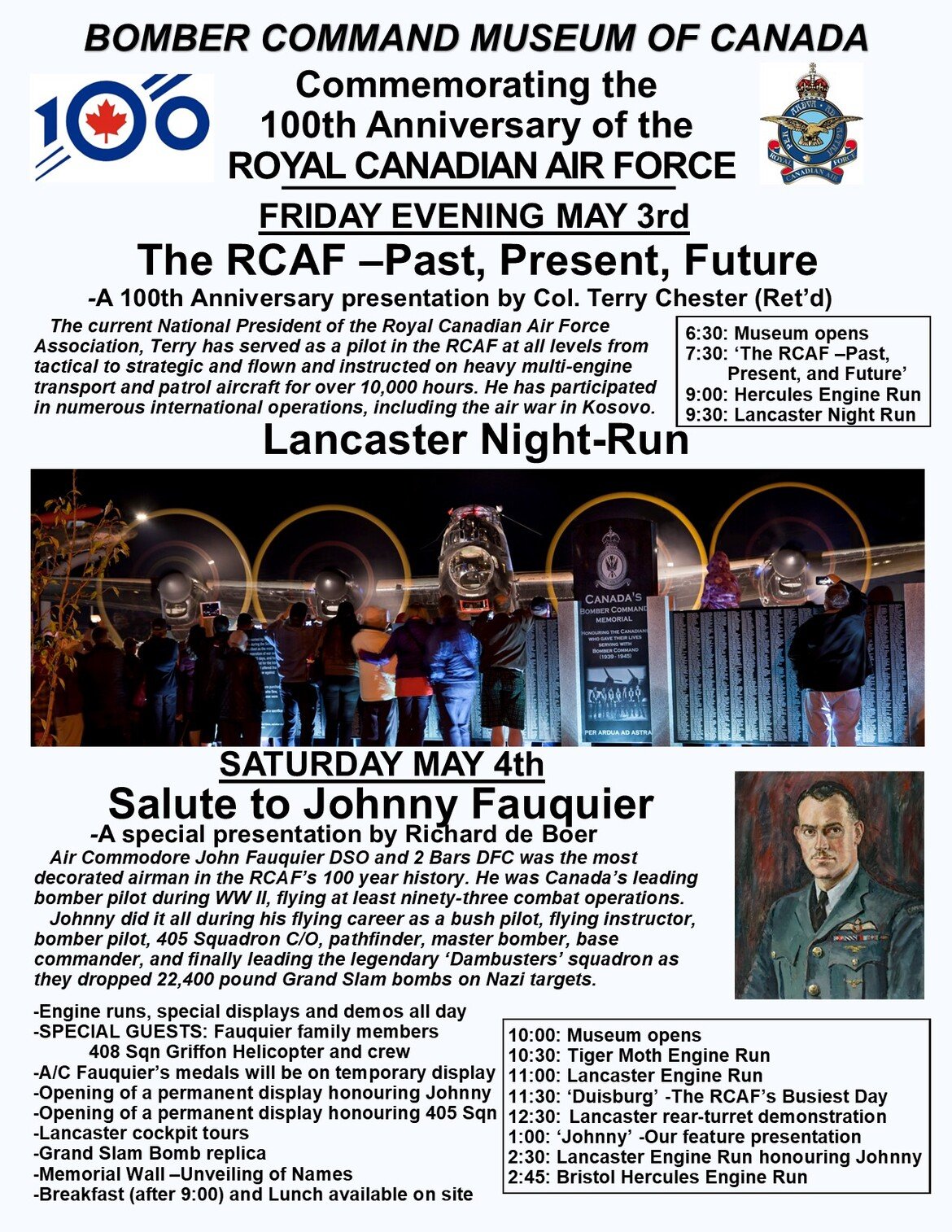 I wanted to remind you of the BIG RCAF 100th Anniversary Event on May 3 and 4, this weekend, at our headquarters at the Bomber Command Museum of Canada (BCMC).